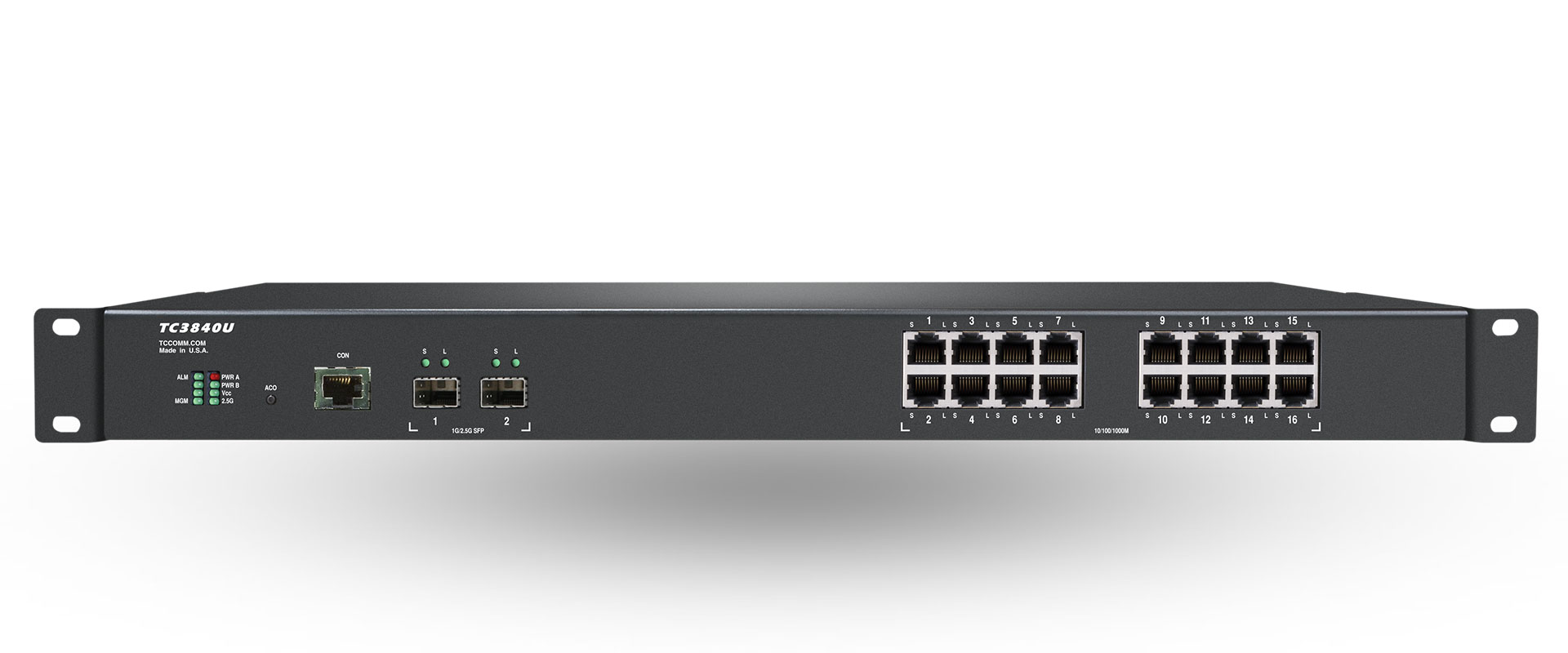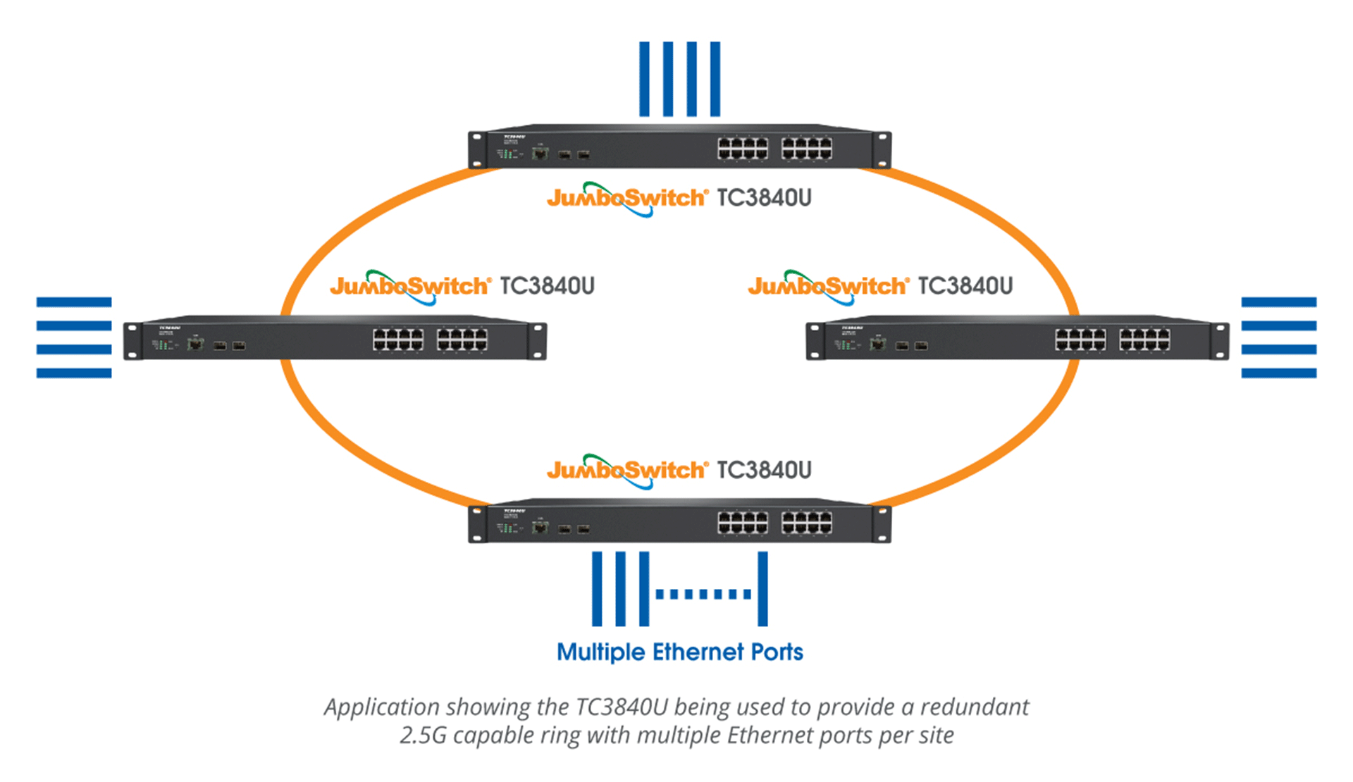 The JumboSwitch® TC3840U is a Layer 2 Ethernet Switch with 22 Gigabit Ethernet ports and 2 Gigabit SFP ports with 2.5G capability for connecting up and down nodes to form a ring or bus topology