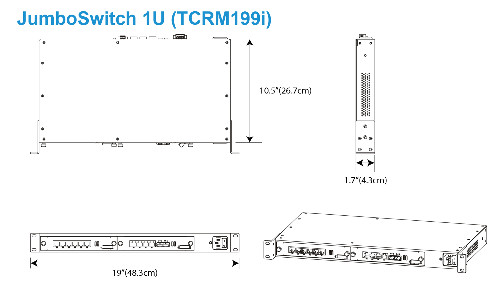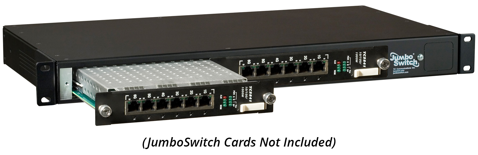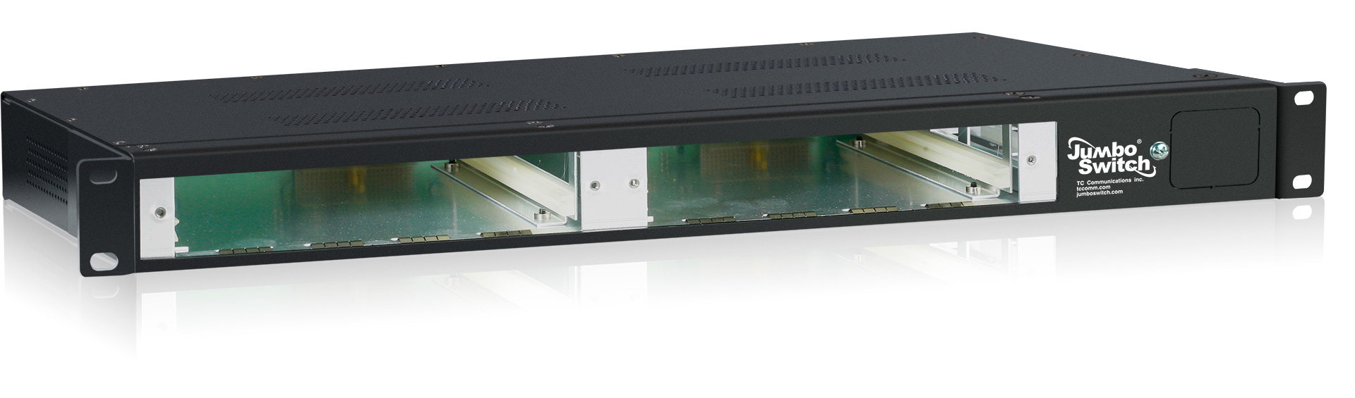The JumboSwitch® 1U (TCRM199i) rackmount cages are designed to hold JumboSwitch® family hot-swappable cards. The TCRM199i hold one or two JumboSwitch family interface cards.